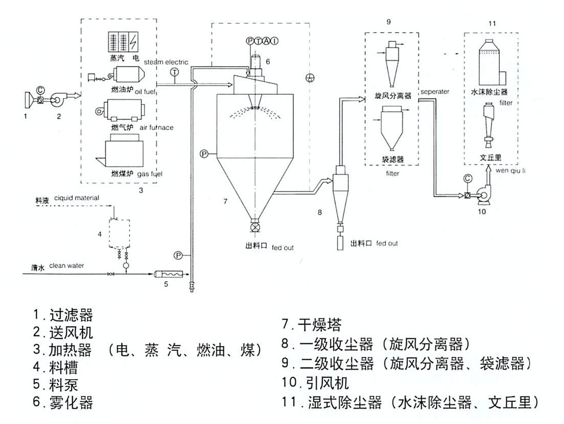 空氣通過過濾器和加熱器,進入干燥塔頂部的空氣分配器,然后呈螺旋狀均勻進入干燥室。料液由料液和熱空氣并流接觸,水份迅速蒸發(fā),在極短的時間內(nèi)干燥為成品。成品由干燥塔底部和旋風分離器排出,廢氣由風機排出。
