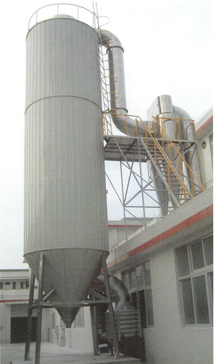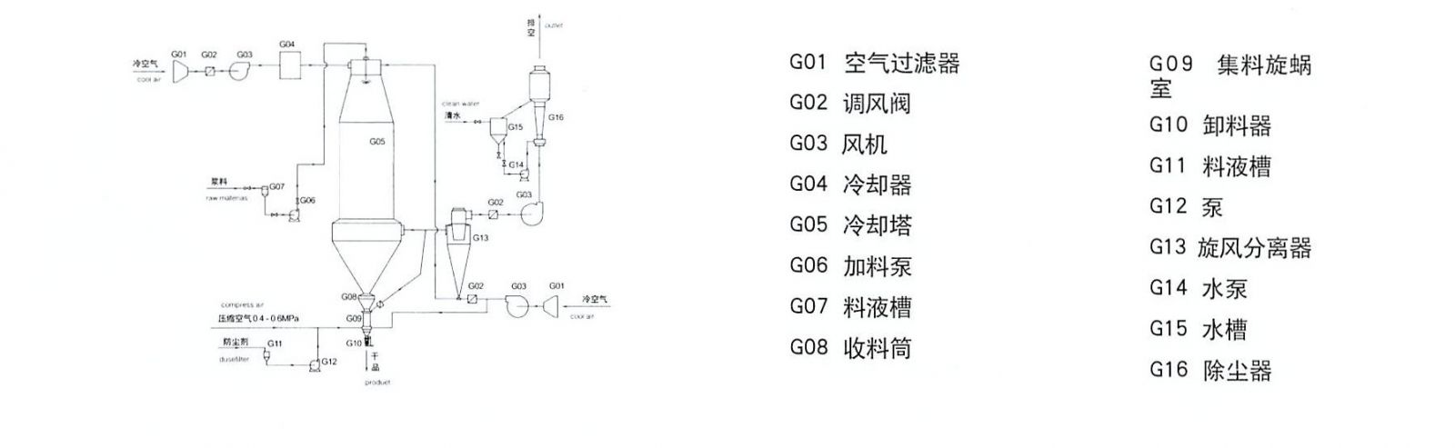 潔凈空氣冷卻后進入制粒塔,在塔內使用離心造粒專用噴頭,通過變頻調速將各種料液霧化成所需要的微小液滴,并與冷風進行快速熱交換,帶走料液中的熱量,物料從塔底和旋風分離器中排出。