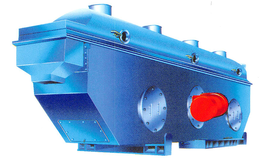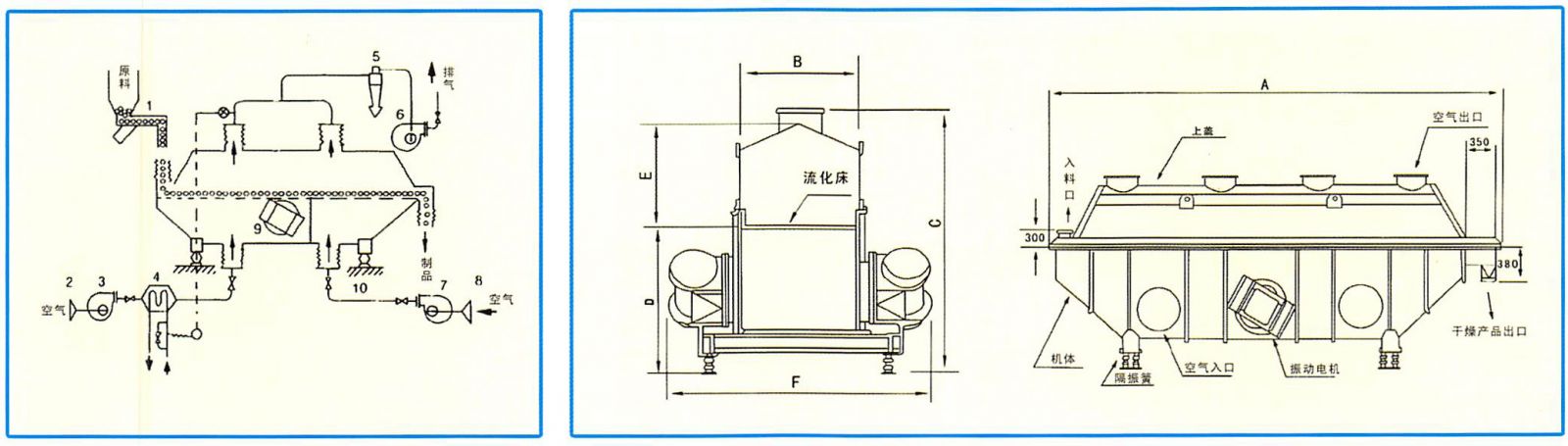 ※ 物料自進(jìn)料口進(jìn)入機(jī)內(nèi),在振動(dòng)力作用下,物料沿水平方向拋擲向前連續(xù)運(yùn)動(dòng),熱風(fēng)向上穿過(guò)流化床同濕物料換熱后,濕空氣經(jīng)旋風(fēng)分離器除塵后由排風(fēng)口排出,干燥物料由排料口排出。