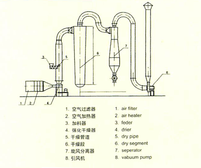 ※ 氣流干燥能從易于脫水的顆粒,粉末狀物料迅速除去水份(主要是表面水分),在氣流干燥中由于物料在干器內(nèi)停留的時(shí)間短,使干燥成品的品質(zhì)得到最佳的控制。我廠(chǎng)強(qiáng)化型氣流干燥是在基本型上增加一套轉(zhuǎn)速可以無(wú)限調(diào)節(jié)的強(qiáng)化器組成,濕物料通過(guò)螺旋加料器進(jìn)入強(qiáng)化器后和熱氣流充分混合,在飛速旋轉(zhuǎn)的擊刀擊碎和推進(jìn)下,物料被破碎成細(xì)顆粒,在干燥同時(shí)向出口移動(dòng),最后在風(fēng)力吸引下進(jìn)入干燥管,進(jìn)一步均勻干燥。風(fēng)力無(wú)法吸引的濕重顆粒繼續(xù)被擊碎、干燥.直至能被風(fēng)吸起進(jìn)入干燥管。